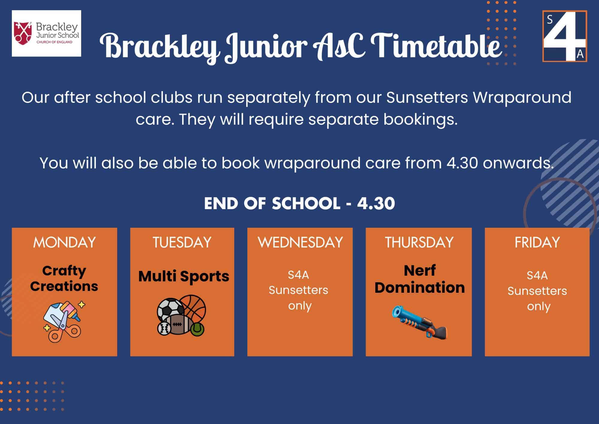 We’re proud to run a variety of exciting After School Clubs at Brackley Junior School, giving children the chance to try something new, stay active, and have fun with friends in a safe, supportive setting. Please note: After School Clubs are separate from our Sunsetters Wraparound Care, and will require a separate booking.