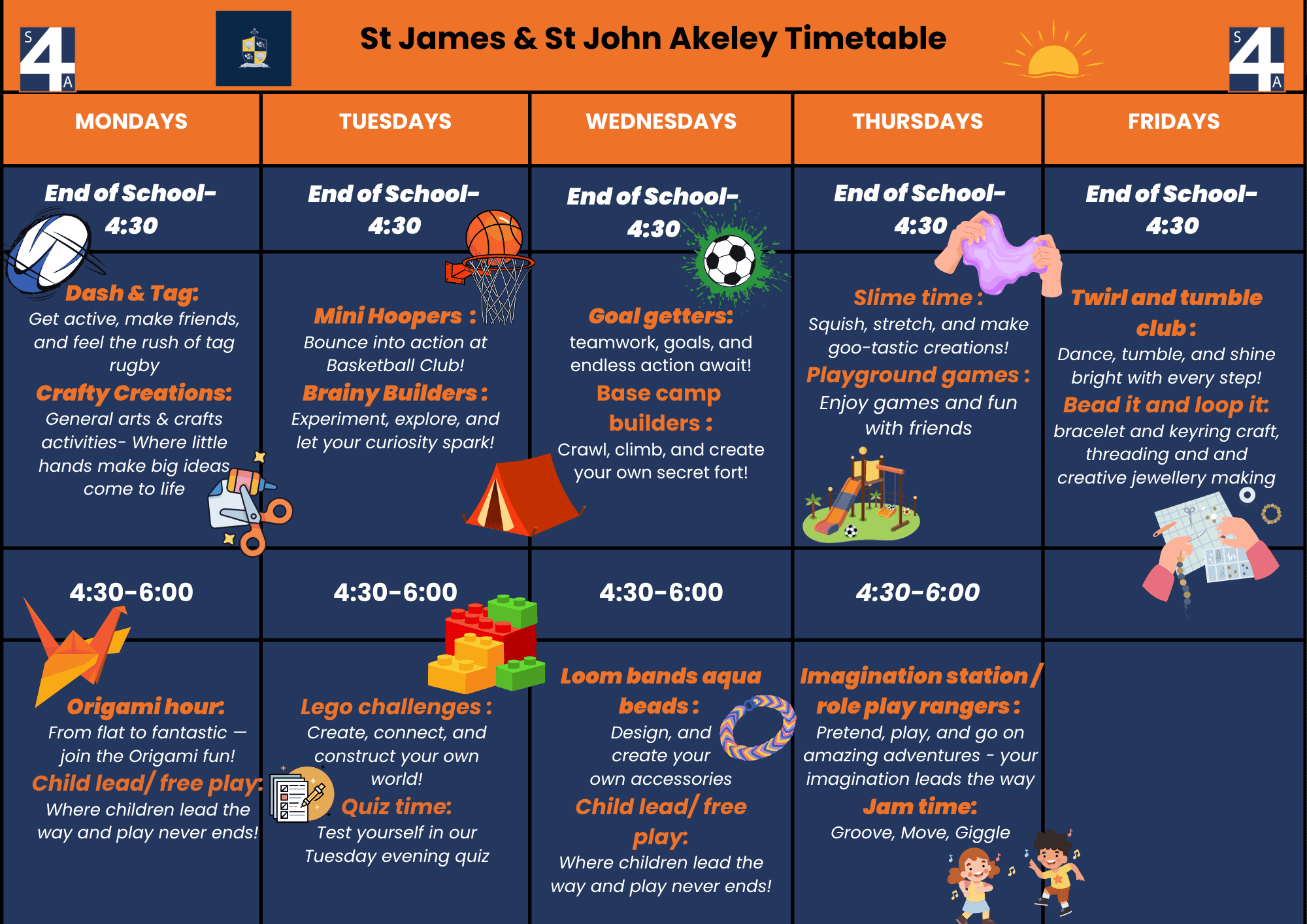 We no longer run separate After School Clubs at St James & St John Akeley – However, we are still offering a range of activities at our wraparound.