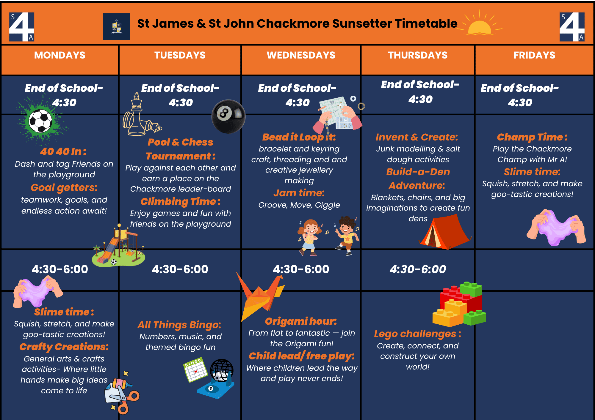 We are delighted to announce new clubs coming to St James & St John Chackmore after the October half term, this includes brand new Cooking Club! Please see the updated timetable on the next tab.